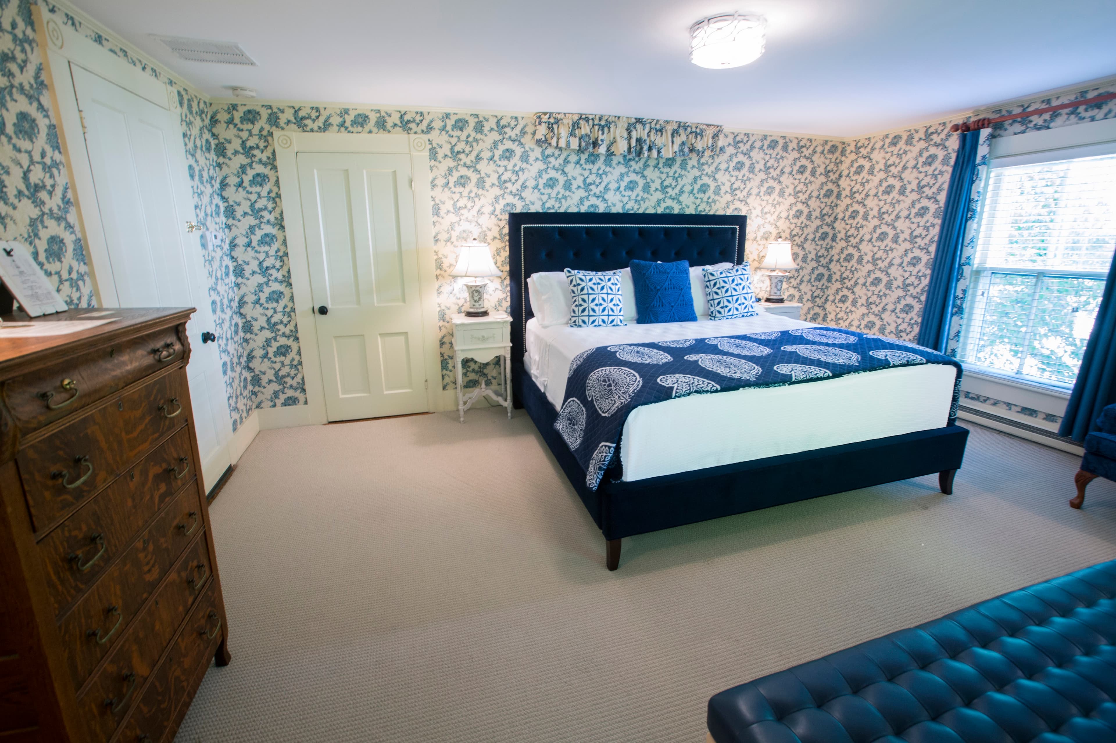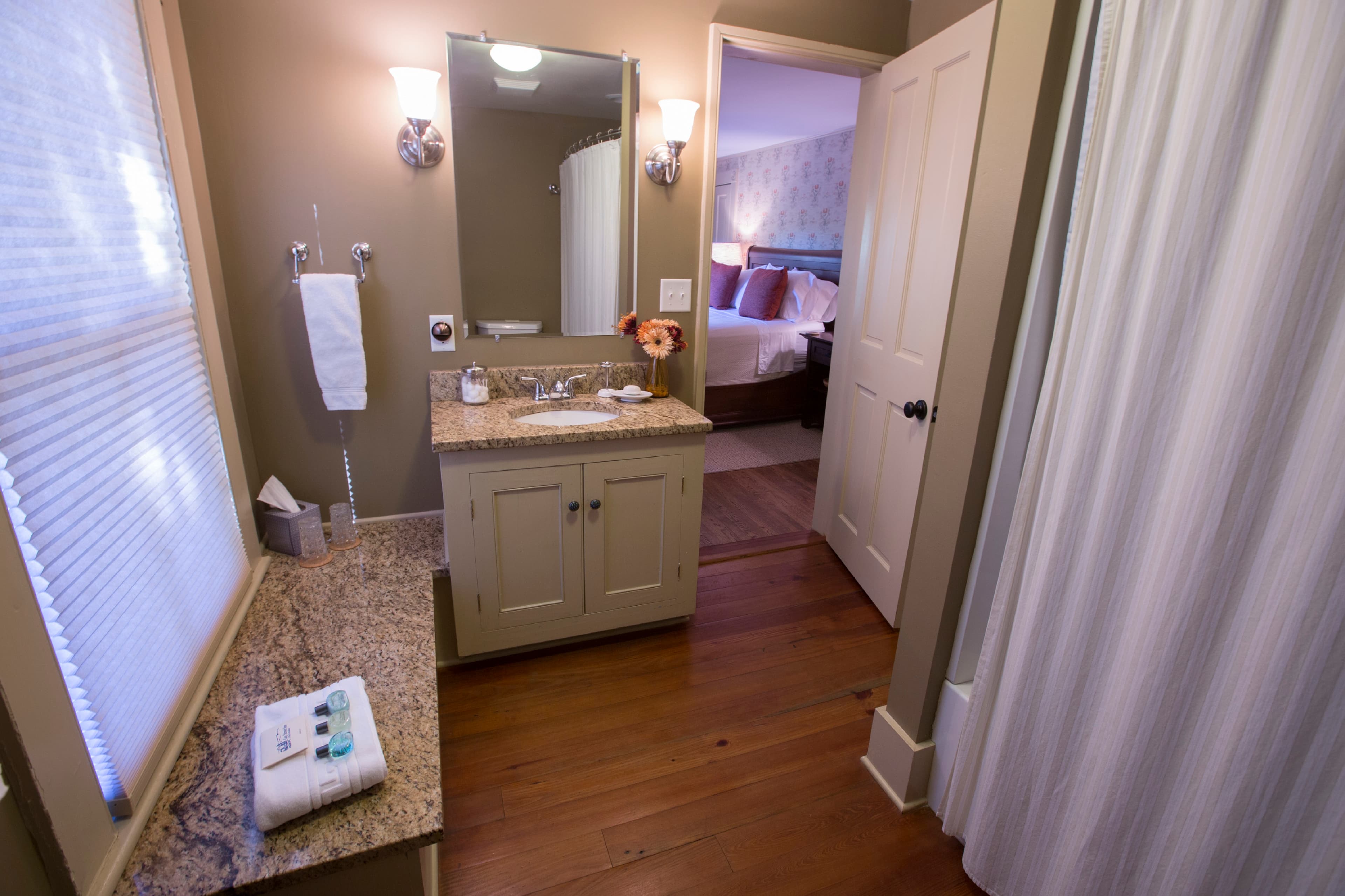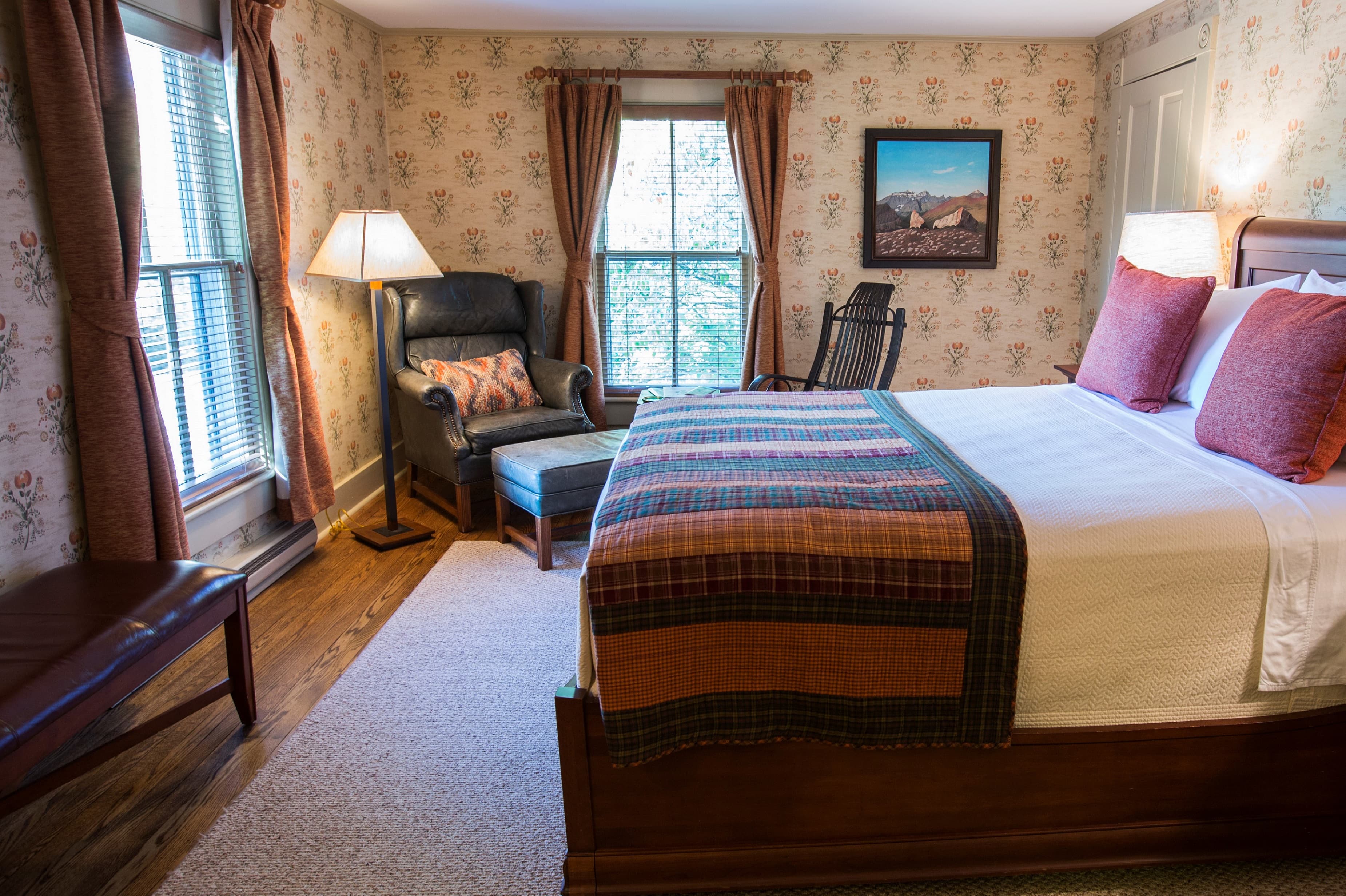 This spacious suite on our first floor features a large bedroom with king-size bed and comfortable, full-size sofa, as well as western views of Jenkins Mountain and Shenandoah National Park. Guests have the option of in-room breakfast served in the spacious breakfast nook which also features a large wet bar with personal Nespresso coffee maker. The private attached bath features marble floors and tile with a walk-in spa shower.